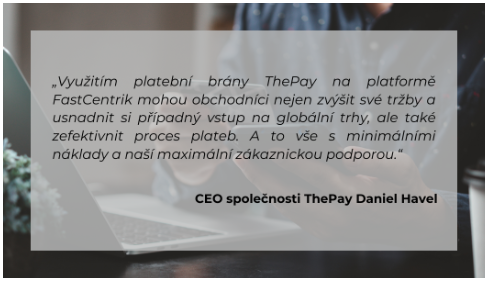 FastCentrik, platforma provozující tisíce e-shopů, nyní umožňuje snadnou implementaci naší platební brány ThePay. Ta obchodníkům přinese nejen pestrou nabídku platebních metod a snadnou instalaci, ale také sníží jejich provozní náklady a zvýší konverze.